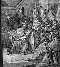 ![]() Князь Довмонт в церкви Святой Троицы перед военным походом кладёт меч перед святым алтарем | |