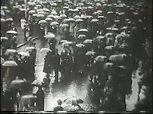 Дождь усиливается, и камера пытается поймать кого-то из горожан, приспосабливающихся к резко изменившейся погоде. Всё находится в движении, поэтому камере не удаётся зафиксировать отдельных лиц: люди торопливо проходят мимо и смешиваются друг с другом в толпе с раскрытыми зонтами.