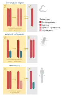 У плодовой мушки Drosophila melanogaster, хотя определение пола, как и у млекопитающих, происходит с помощью половых хромосом, телец Барра в ядрах самок нет. Зато X-хромосома самцов становится гиперактивной, уровень экспрессии её генов достигает суммарного уровня экспрессии с обеих X-хромосом самок. В обеспечении такой активности ключевую роль играет рибонуклеопротеиновый комплекс MSL (англ. Male specific lethal), который, как свидетельствует его название, является необходимым для жизнедеятельности самцов[4]. В состав MSL входят белки продукты генов msl1, msl2, msl3, mle, mof, что вместе с некодирующими РНК RoX1 и RoX2 формируют компенсасому. Компенсасомы присоединяются к сотням генов, сцепленным X-хромосомой самцов, и избирательно усиливают транскрипцию некоторых из них, доводя её до уровня экспрессии в организме самок. Экспрессия по крайней мере некоторых из msl-генов находится под негативным контролем продукта гена Sxl (англ. Sex lethal), участвующий в подсчете X-хромосом и определении пола[5][6].