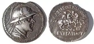 Серебряная тетрадрахма кушанского царя Герайоса (1-30 гг. н. э.) в греко-бактрийском стиле с всадником, коронованным греческой богиней победы Никой.
