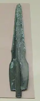 - бронзовый меч с широким лезвием (яп. 平形銅剣) — меч с плоским ребром и широким лезвием, который развился из мечей с узкими лезвиями. Распространен был на Кюсю и прибрежных районах Внутреннего Японского моря. Характерной особенностью такого меча являются выступления с обеих сторон лезвия в виде острия рядом с рукояткой. Такие мечи богато украшены. Были распространены в конце периода Яёй.