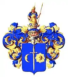 В голубом щите вертикально золотой меч остриём вниз. Справа от меча, рогами к нему золотой полумесяц с человеческим лицом, слева солнце с человеческим лицом. Щит увенчан дворянским коронованным шлемом. Нашлемник: стоящая женщина в золотых латах и шлеме, в голубой одежде держит в левой руке золотое копьё. Намёт: голубой с золотом.