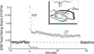 Долговременная потенциация была открыта норвежским учёным Терье Лёмо (Terje Lømo) в 1966 году при проведении опытов на гиппокампах кроликов[1]. Первая научная работа, описывающая процесс LTP, была опубликована Терье Лёмо и Тимоти Блиссом (Timothy Bliss) в 1973 году[2].