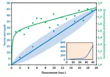 В работе[2] приводятся результаты исследования популяции A-1, одной из 12, участвовавших в эксперименте. Авторы разделяют эволюцию популяции на два этапа, граница между которыми примерно приходится на поколение 26 000.