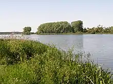 Прибрежная растительность образует прерывистую узкую полосу, ширина которой не превышает 25 м[8]. На песках произрастают разреженные заросли тростника, на глинистых и заиленных участках мелководья — камыш, тростник, хвощ. Растения с плавающими листьями встречаются лишь на мелководьях северо-запада и юго-востока[7].