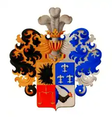 Щит четверочастный. В первой, золотой части, чёрное орлиное крыло, влево. Во второй, лазоревой части, три серебряные лилии, 1, 2. В третьей, червлёной части, золотые весы. В четвёртой, серебряной части, выходящая с правой стороны из лазореваго облака, в чёрных латах рука, держащая выгнутый, с золотою рукоятью, меч.