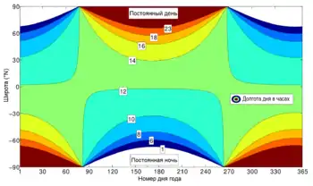 Долготу дня D (в часах, при отсутствии полярного дня и полярной ночи) можно вычислить по следующей формуле[4]: