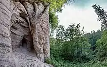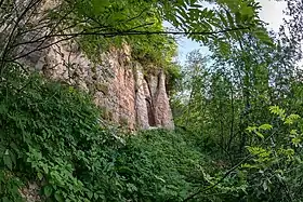 На срезах можно наблюдать формы ветровой дефляции - карнизы и ниши, борозды, ячейки выветривания. выветривание в этой местности происходит интенсивно, у подножия обрыва скапливается разрушенный материал, который постепенно покрывается растительностью[3].
