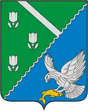 «Зелёно-лазоревое (синее, голубое) поле скошено справа серебряной чешуйчатой нитью. В зелёном поле три серебряные садовые лилии на стеблях с листьями (две слева одна справа), сопровождаемые справа вверху серебряной перевязью; в лазоревом поле — серебряный обращенный влево с воздетыми крыльями орёл, держащий в когтях золотую рыбу головой вправо»[3]