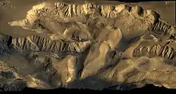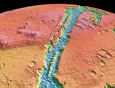 ![]() Долины Маринер простираются более чем на 4000 км по поверхности Марса, в основном с востока на запад чуть ниже экватора, как видно на данном изображении, составленном из нескольких снимков с КА «Viking 1». | |