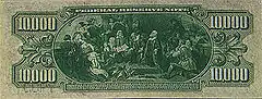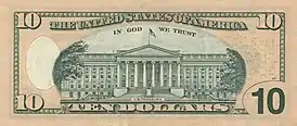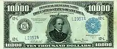 - Глава Министерства Финансов во время правления президента Линкольна, а впоследствии глава Верховного Суда США Салмон Чейз (англ. Salmon Chase) — на банкноте в 10000 долларов. Салмон Чейз первым распорядился поместить на американских деньгах надпись In God We Trust (с англ. — «Мы верим в Бога»[10]) — её начали чеканить на монетах достоинством 2 цента в 1864 году. На бумажных долларах она появилась в 1957 году, а с 1963 года используется постоянно. Любопытно, что первая банкнота достоинством 1 доллар, выпущенная в 1863 году, содержала не изображение Джорджа Вашингтона, а портрет Салмона Чейза (банкнота в 10 000 долларов уже не выпускается, но >100 шт. всё ещё находятся в обращении и являются законными платёжными средствами).