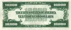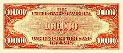 Банкноты 100 000 долларов выпущены в 1934 году, в обороте не находились и использовались только во внутренних расчётах ФРС и казначейства.
