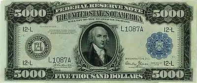 - 4-й президент Джеймс Мэдисон (англ. James Madison) — на банкноте в 5000 долларов.