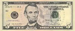 - 16-й президент США, победитель в войне Севера и Юга, Авраам Линкольн (англ. Abraham Lincoln) — на банкноте в 5 долларов.