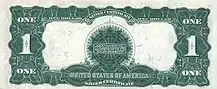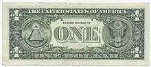 На оборотной стороне однодолларовой банкноты помещены два изображения двухсторонней Большой печати США. Именно к большой печати (а не к дизайну самой банкноты) относятся все наиболее часто обсуждаемые элементы: 13 полос на щите орла, оливковая ветвь с 13 кисточками и 13 стрел в его лапах, 13 звёзд в облаке над головой орла, 13 ступеней в усечённой пирамиде (первоначально в США вошло 13 штатов), римские цифры MDCCLXXVI означают число 1776 (год провозглашения Декларации независимости), отрезанная верхушка пирамиды со вписанным глазом («Всевидящее око», весьма древний религиозный символ), латинские надписи «E pluribus unum» (13 букв, «Из многих — единое»), «Annuit Cœptis» (13 букв, если букву œ считать за две, «Он одобряет наши деяния») и «Novus Ordo Seclorum» («Порядок нового века») — цитаты заимствованы из «Энеиды» Вергилия и символизируют наступление «американской эры». Обычно все эти элементы связывают с масонством.
