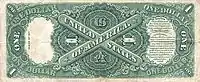 На другой стороне банкнот помещены изображения, иллюстрирующие историю США. На достаточно редко встречающейся банкноте в 2 доллара — подписание Декларации Независимости, на 5 долларах — расположенный в Вашингтоне Мемориал Линкольну, на 10 долларах — здание Министерства финансов США, на 20 долларах — Белый дом, на 50 долларах — Капитолий, на 100 долларах — Индепенденс-холл, находящееся в Филадельфии здание, в котором была подписана Декларация Независимости. Время, которое указывают часы на башне на обратной стороне банкноты в 100 долларов — 14 часов 22 минуты, хотя в некоторых источниках можно найти, что время на часах — 16 часов 10 минут[11]. Это легко можно опровергнуть, изучив изображение в большом разрешении.