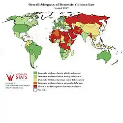 Законы о домашнем насилии различаются в зависимости от страны. Хотя в Западном мире это вообще запрещено, во многих развивающихся странах это не так. Например, в 2010 году Верховный суд Объединённых Арабских Эмиратов постановил, что мужчина имеет право физически наказывать свою жену и детей, если он не оставляет на них физических следов[173]. Социальная приемлемость домашнего насилия также различается от страны к стране. В то время как в большинстве развитых стран домашнее насилие считается неприемлемым для большинства людей, во многих регионах мира мнения расходятся. Например, согласно исследованию ЮНИСЕФ, можно увидеть процент женщин в возрасте 15—49 лет, которые считают, при определённых обстоятельствах, оправданным битье или избиение мужем своей жены: 90 % в Афганистане и Иордании, 87 % в Мали, 86 % в Гвинее и Тиморе-Лести, 81 % в Лаосе, 80 % в Центральноафриканской Республике[174]. Отказ подчиниться желаниям мужа является распространённой причиной оправдания насилия в развивающихся странах[175]: например, 62,4 % женщин в Таджикистане оправдывают избиение жены, если жена выходит в свет, не сказав мужу; 68 %, если она спорит с ним; 47,9 %, если она отказывается заниматься с ним сексом[176].
