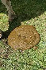 Пища проходит по пищеварительному тракту в течение 2—3 суток, а клетчатка — до 12 суток. Скорость прохождения кормовых масс через пищеварительный тракт составляет 17,7 см в час или 4,2 м в день. За день крупному рогатому скоту необходимо выпаивать 25—40 л воды при кормлении зелёной массой, и 50—80 л при кормлении сухими кормами. В норме фекалий выделяется 15—45 кг за сутки, они имеют тестообразную консистенцию и темно-коричневый цвет. Процент содержания воды в нормальных фекалиях составляет 75—85 %[23].