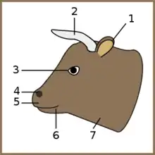 Зубы приспособлены для пережёвывания растительного корма. У молодых коров 20 (12 коренных и 8 резцов на нижней челюсти), а у взрослых 32 зуба (24 коренных и 8 резцов). Клыки отсутствуют. Молочные зубы намного меньше коренных, но одинаковые по форме. Зубная формула взрослой коровы выглядит следующим образом: . Длинные, острые, косопоставленные и направленные вперёд резцы имеются только на нижней челюсти. Два резца, расположенные в середине, называют зацепами, соседние с ними два зуба с правой и левой стороны зовутся внутренними средними, следующие два зуба с обеих сторон носят название наружные средние, а два крайних резца называются окрайками[20]. На верхней челюсти на месте резцов имеется дёсенный валик. Нижняя челюсть приспособлена совершать круговые движения. Резцами коровы скашивают траву, а молярами перемалывают корм. Шершавый и подвижный язык покрыт сосочками[21]. Морда крупная и широкая. Лоб довольно широкий, плоский, в верхней части иногда покрыт густой, курчавой шерстью. На голове у коров имеются 2 полых рога, хотя бывают и безрогие (комолые) коровы. Высота рогов зависит от породы, а также варьируется индивидуально. В целом, рога направлены вверх или вбок, их форма напоминает лиру. Уши низкие, имеют форму рожка, у зебу имеются «серёжки». Снаружи они покрыты тонкой короткой шерстью, а изнутри растёт длинная шерсть. Глаза крупные, шаровидные[21].