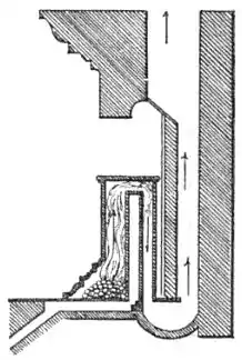 Будучи человеком бережливым, Бенджамин Франклин обратил внимание на то, что в существовавших в то время каминах с трубой по внешней стене дома бо́льшая часть тепла бесполезно теряется в трубе. В 1741 году[4] он изобрёл экономичную печь, стенки которой выполнены из чугуна, обладающего высокой теплопроводностью. Такая печь одновременно была и котлом (топка — камера, где сжигалось топливо), и радиатором (стенки печи, излучающие тепло нагревали воздух в помещении). Холодный воздух для горения забирается снаружи помещения и подводится к перегородке (дефлектору) через канал в полу[5]. Низкая температура наружного воздуха приводит к усилению тяги и более эффективному сжиганию топлива, без потребления для этого согретого воздуха помещения. Дым выходит через U-образный отвод в полу. Таким образом, ему удалось уменьшить потери тепла, расход топлива и размеры печи.
