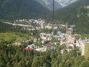Одновременно со строительством гостиниц и турбаз строились канатные дороги — маятниковая (введена в эксплуатацию в 1986 году), 5 очередей строительства однокресельных и парнокресельных дорог на гору Мусса-Ачитара (Мусат-Чери, завершены к 1970, 1971, 1976, 1983 и 1987 годам соответственно). Уже в постсоветский период, в 2004—2007 годах, сооружены три очереди новой канатной дороги — один участок гондольной и 2 участка многокресельной, которые доставляют лыжников на самую вершину горы Мусса-Ачитара (около 3200 м)[8].