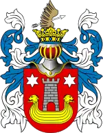 В вершине шлема левое коршуново крыло, проткнутое серебряной стрелой влево. Намёт голубой с серебряным подбоем. Герб внесён в Гербовник дворянских родов Царства Польского, часть 1, стр. 212.