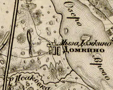 ДОМКИНО — деревня и мыза владельческие при озере Вреве, число дворов — 22, число жителей: 73 м. п., 77 ж. п.[8] (1862 год)