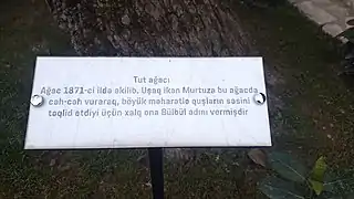 «В этом доме родился и провел детские годы основоположник Азербайджанского советского профессионального вокального искусства, Народный артист СССР, лауреат Государственной премии СССР, профессор Бюль-Бюль»[4].