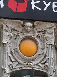 Арочные оконные проёмы второго этажа увенчаны прямыми профилированными сандриками по центральным осям и сандриками в виде треугольных фронтонов в осях ризалитов. В уровне первого этажа расположены три витринных окна. По низу витрин проходит металлическое ограждение в стиле модерн[2].