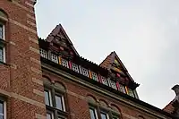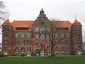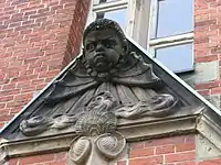 Считается, что Генрих Зауэрманн сыграл важную роль в многогранном дизайне фасада здания[3]. Элементами этого фасада являются, например, герб Фленсбурга над главным входом, надпись над средним входом на задней стороне «Work staelt — Art Animation»[1], солнечные часы на южной стороне здания, голова нордического дракона[5] и немецкий имперский орёл на западной стороне здания[4][5].
