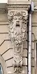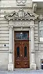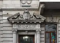 Прямоугольные торговые площади первого этажа выполнены из необработанного камня (рустика). Вход во двор - металлические ворота по оси центральной части. Архитектору удалось подчеркнуть важность центральной части, гармонично распределив архитектурную композицию фасада на первом и втором элементах укрепив ее невысокой мансардой. Пилястровая сторона фасада повторяет композиционный прием центрального фрагмента, где архитектурно спроектированные балконы-скобки расположены в соответственно подходящих местах на фасаде. Для решения фасадной композиции архитектор использовал компактную номенклатуру формы деталей и элементов[5].