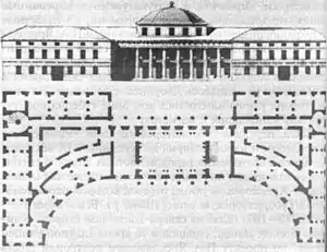 | Чертёж конца XVIII века проекта здания присутственных мест. | Вид присутственных мест в начале XIX века от Университетской улицы с северной части Соборной площади. Слева видна старая колокольня Успенского собора. | Гравюра XVIII века с видом присутственных мест с обратной стороны (с Сергиевской площади) |