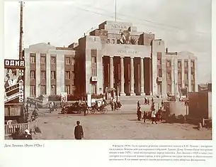 Средства на постройку дома собирались путём отчисления однодневного заработка рабочих и распространения марок «Кирпич на постройку Дома Ленина». Закладка здания состоялась 13 июля 1924 года. Победу на конкурсе проектов одержал проект М. Купцова, представляющий собой традиционное двухэтажное здание «народного дома». Но сразу же началась перестройка здания в стиле «революционного романтизма». Был надстроен ещё один этаж, а центральная часть фасада была дополнена навершием, повторяющим очертания мавзолея В. И. Ленина в Москве. Фронтон был украшен надписью «Ленин умер. Жив ленинизм. 1870—1924». 21 января 1925 года в большом зале состоялось торжественное собрание, посвященное годовщине смерти Ленина. Практически сразу появились идеи новой перестройки здания. Летом 1926 года строительство дома было завершено.