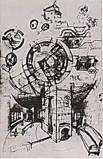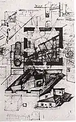 | Эскизы квадратного в плане дома-мастерской, 1920-1921 годы | Один из «круглых» вариантов проекта, 1922 год | |