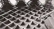Доски перекрытия пересекаются под прямым углом, образуя сетку из квадратных ячеек размером 0,5×0,5 м. Сверху и снизу эта сетка зашита деревянным настилом из шпунтованных досок, диагонально направленных по отношению к ней. В результате этого в устройстве междуэтажных перекрытий не использованы колонны, стропила и балки, а перекрытие конструктивно работает как единая плита-мембрана[3]. Такое перекрытие обеспечивает конструктивную надёжность, даже прогибаясь под тяжестью. Так, в мастерской архитектора со временем потолок несколько провис, однако Мельников при ремонте не стал его выпрямлять, объяснив это тем, что выгнутый в виде линзы потолок лучше улавливает свет, отражая его вниз[3].