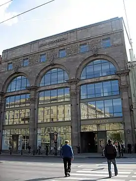 В 1911—1912 годах по проекту архитектора М. С. Лялевича здесь было возведено здание торгового дома для фирмы меховых изделий Ф. Л. Мертенса. При проектировании здания были применены абсолютно новые инженерные и художественные решения: монолитная железобетонная несущая конструкция здания и три огромные застеклённые арки, украшающие его монументальный фасад[3].