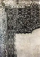 Основные серебряные ветви фриза дворца Шекинских ханов окружены реалистично изображёнными цветами; здесь было использовано большое количество серебра, при этом цвета светлее.[9] Узоры же в доме Мехмандаровых представлены в более тёмных тонах.[9] Узоры на фризе повторяются также на тимпанах панно.[9]
