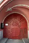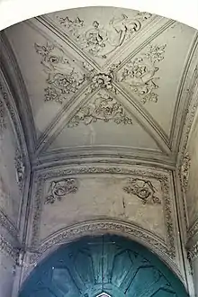 Парадный вход устроен не просто с улицы, а через ворота, украшенные статуями крылатых демонов, удерживающих эркер. Проезд во двор учитывал габариты конных экипажей, вследствие чего по обеим сторонам видны возвышения, ограничивавшие движение колёс относительно ворот. Обращает на себя внимание искусный лепной свод в проезде и тяжёлые наборные створы ворот и парадных дверей. На пороге гостей встречает приветственная надпись «Salve», сделанная в мозаичном полу в технике «терраццо». Бросается в глаза отделка лестницы алебастровыми фигурными балясинами. Такой лестницы, как и другого такого дома, в Киеве не существует.
