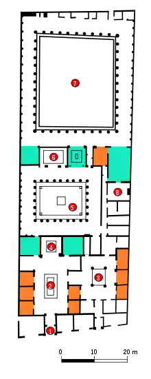 Дом занимал площадь почти три тысячи квадратных метров. Он содержит два атриумa; один принадлежал к основной части дома и был доступeн сразу после пересечения вестибюля и небольшого входа, называемого fauces. В атриуме, построенном в тосканском стиле, находился имплювий, красоту которого можно представить до сих пор. Дно было заполнено инкрустацией из цветного мрамора в виде правильных геометрических фигур. Второй атриум располагался справа от главного входа. Центральную часть атриума занимал тетрастиль с отдельным входом, который, вероятно, служил для развлечения посетителей.