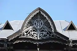 Резные наличники окон, ограждения лоджий, пропильные узоры, торжественное оформление парадного входа и фасада в стиле модерн вносят в постройку большую выразительность.