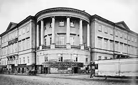 Слева - Императорский почтамт на Мясницкой улице. Справа - церковь Флора и Лавра и Юшков дом.