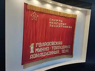 Экспозиции музея занимают несколько залов и посвящены участию 1-го гвардейского минно-торпедного авиационного полка ВВС Балтийского флота в боевых операциях как Великой Отечественной, так и советско-финской войны[16].