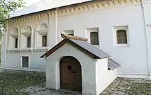 К северной части западного фасада примыкает небольшой каменный пристрой с двускатной тесовой крышей, служащий тамбуром входа в два северных помещения, соединённых между собой, а также тамбуром входа в помещения второго этажа, куда ведёт деревянное крыльцо под односкатной крышей[4].