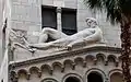Нижний фасад подчеркивает большой вход — портал, с округлой аркой, высотой в два этажа. Этот глубокий, растопыренный проход имеет арочные перемычки, украшенные «растительным» орнаментом. Стены под огромной аркой имитируют завитки акантовых листьев из терракотовых рельефов.