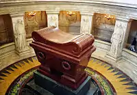Саркофаг из шокшинского малинового кварцита[5], ошибочно называемого красным порфиром или мрамором, с останками императора Наполеона располагается в крипте собора. Его охраняют две бронзовые фигуры, держащие скипетр, императорскую корону и державу. Гробницу окружают 12 статуй работы Жана Жака Прадье, посвящённых победам Наполеона.