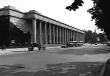 После того, как стеклянный дворец в Старом ботаническом саду сгорел в 1931 году, ассоциации художников Мюнхена Münchner Künstlergenossenschaft , Munich Secession и Munich New Secession основали «Munich Exhibition Management», чтобы построить новый выставочный дом для своих ежегодных художественных выставок и других мероприятий. В 1931 году они заказали мюнхенскому профессору архитектуры Адольфу Абелю новое здание на том же месте. После Адольфа ГитлераСтав канцлером в январе 1933 года, он отказался от проекта непосредственно перед запланированным началом строительства весной 1933 года. Он разместил заказ на новое планирование лично Полю Людвигу Троосту, Гитлер уже перестроил коричневый дом штаб-квартиры нацистской партии . Строительной площадки в старом ботаническом саду было недостаточно для монументальных планов Гитлера. В качестве нового места он устроил южный вход в Английский сад.