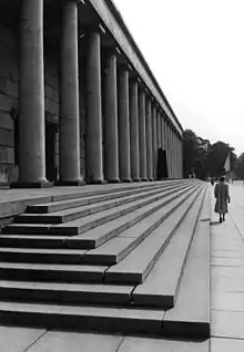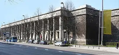 Массивный фасад по диагонали, с рядом колонн, лестничным пролётом и ветвями лип перед зданием. Главный вход Взгляд вверх под углом с колоннами и кассетами в потолке портика Загляните под портик, ленты в потолке со свастикой — орнаментом . Монументальный зал, построенный на строительной сетке. Средний зал, 2006 В контексте оформления Мюнхена как " столицы движения " Троост создал первые проекты монументальных зданий для национал-социалистического режима для Дома немецкого искусства и двух зданий НСДАП на Кенигсплац .