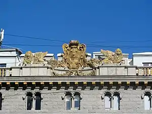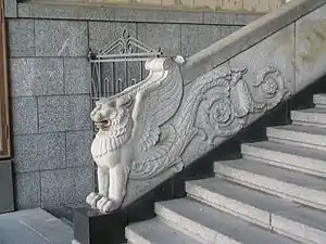 Особенностью здания являются широкие лестницы со статуями сидящих грифонов. Здание выполнено в стиле неоренессанс, о чем говорят золотые детали на фасаде, керамические капители коринфских полуколонн, модульоны венчающего карниза, пятиметровая композиция с гирляндами фруктов и парой крылатых львов на крыше. Фасады и интерьеры здания были выполнены по проекту скульптора Александра Громова и керамиста Петра Ваулина[1].