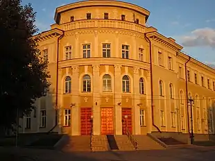 Расположенная на углу приподнятая часть здания скруглённой формы соединяет стыки корпусов и завершается декоративным куполом. В ней находится главный вход в дом культуры[1].