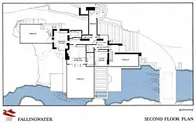 Из консольной части гостиной комнаты лестница спускается прямо к ручью внизу, а в пространство перехода между главным домом и домиком для гостей естественным образом поступает горная вода, которая, достаточно накопившись, вытекает наружу. Спальни в доме небольшие, у некоторых довольно низкий потолок, который как бы говорит обитателям дома — почаще бывайте на свежем воздухе, а не в помещении. В дизайне дома применено максимально широкое остекление, есть множество остеклённых балконов. Получить доступ к лестнице, ведущей из гостиной вниз, к водному потоку (упомянутому выше), можно через большие стеклянные двери, раздвигающиеся в горизонтальной плоскости. Главный же вход в здание, согласно архитектурным воззрениям Райта, расположен вдали от водопада.